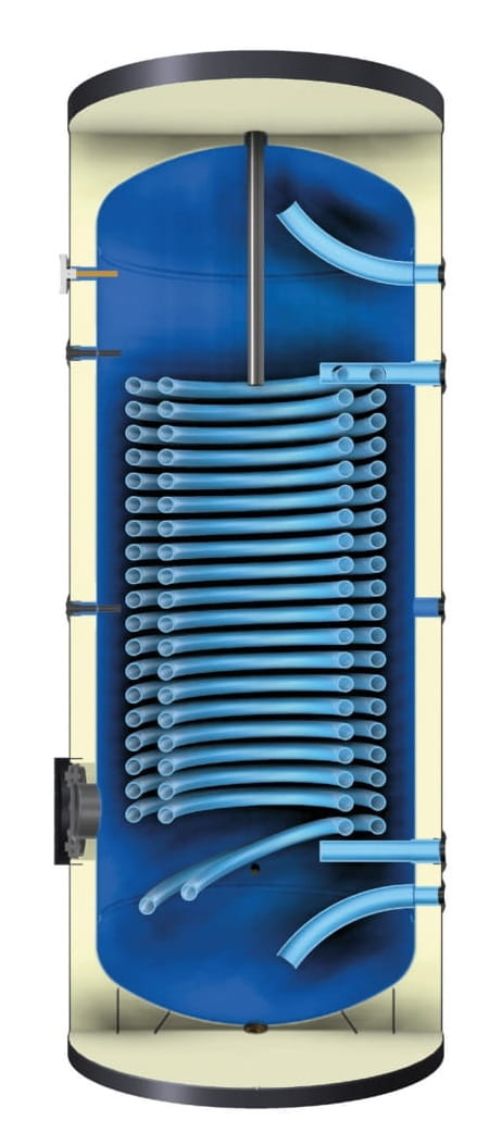 - Dwurzędowa wężownica o maksymalnie dużej powierzchni wymiany i mocy grzewczej zapewnia bezkonkurencyjną szybkość grzania wody.